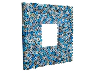 I made this by upcycling magazines and cardboard boxes and using a picture sawtooth hanger I already had. Each magazine roll was first rolled into a long roll and then tightly rolled again into a circle shape. I sealed each roll individually with non-toxic glue for longevity. The core is made from several layers of cardboard so it is very sturdy.